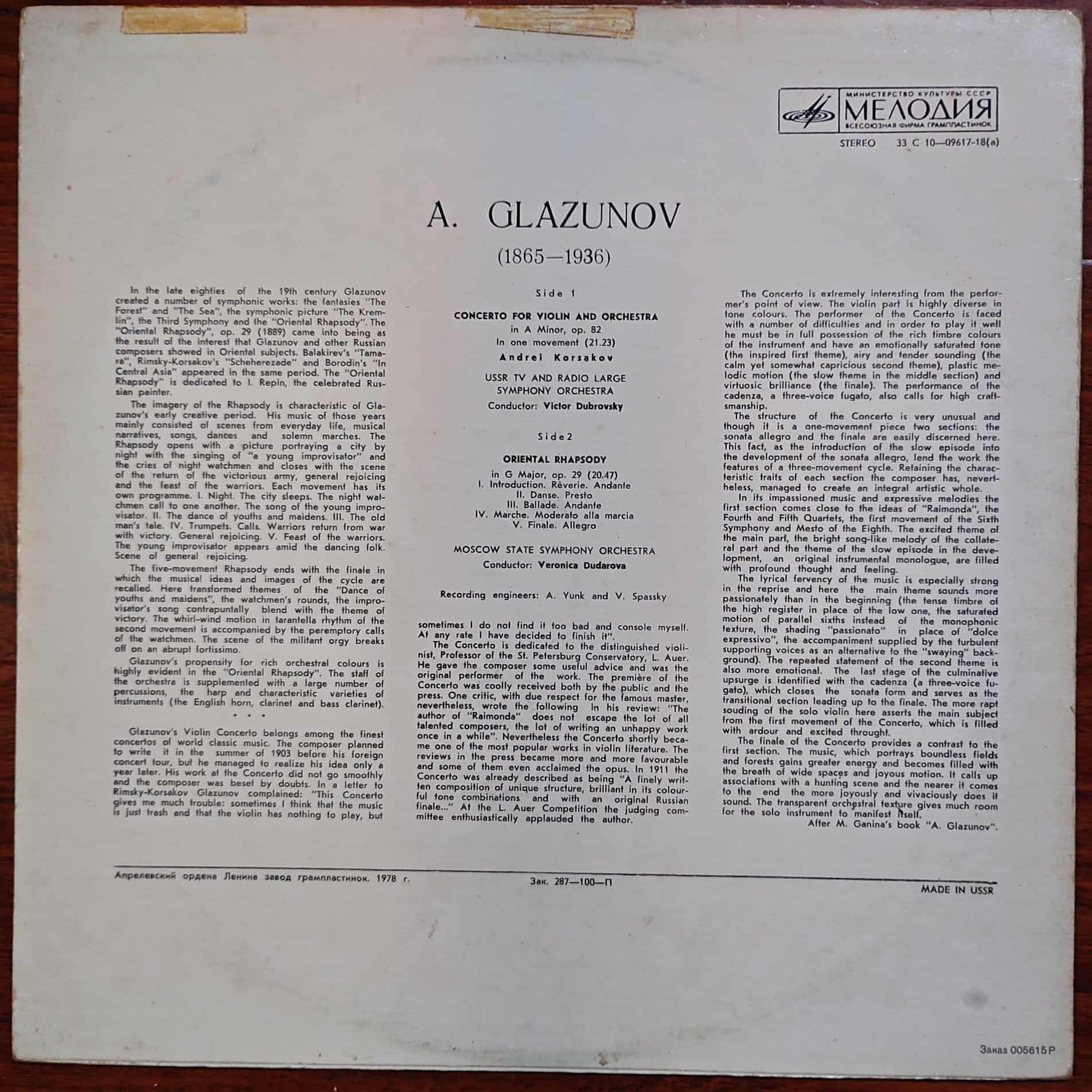 A. Glazunov, Andrei Korsakov – Concerto For Violin And Orchestra / Oriental Rhapsody