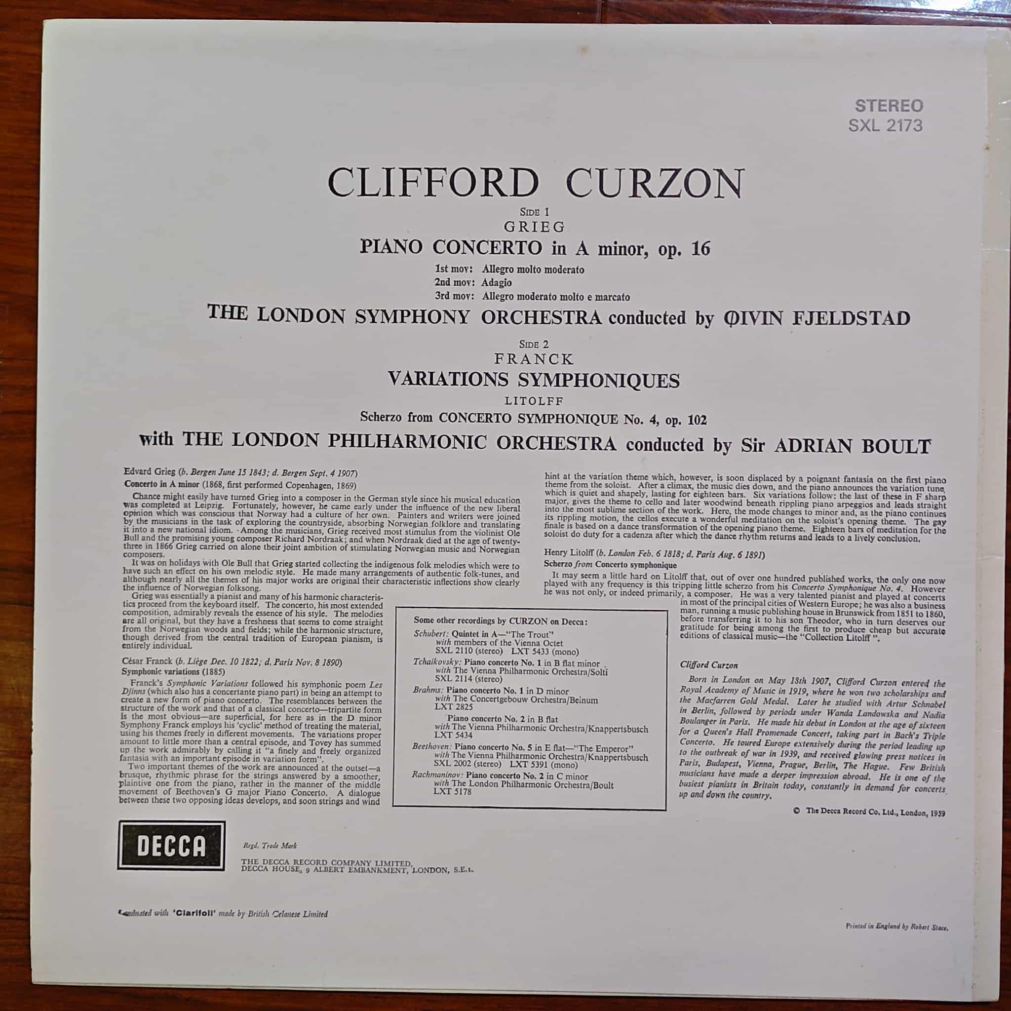 Đĩa nhạc nổi tiếng của Clifford Curzon, ông trình diễn piano concerto của Grieg & các bản nhạc khác của Litolff & Franck, dàn nhạc The London Philharmonic Orchestra & nhạc trưởng Sir Adrian Boult.