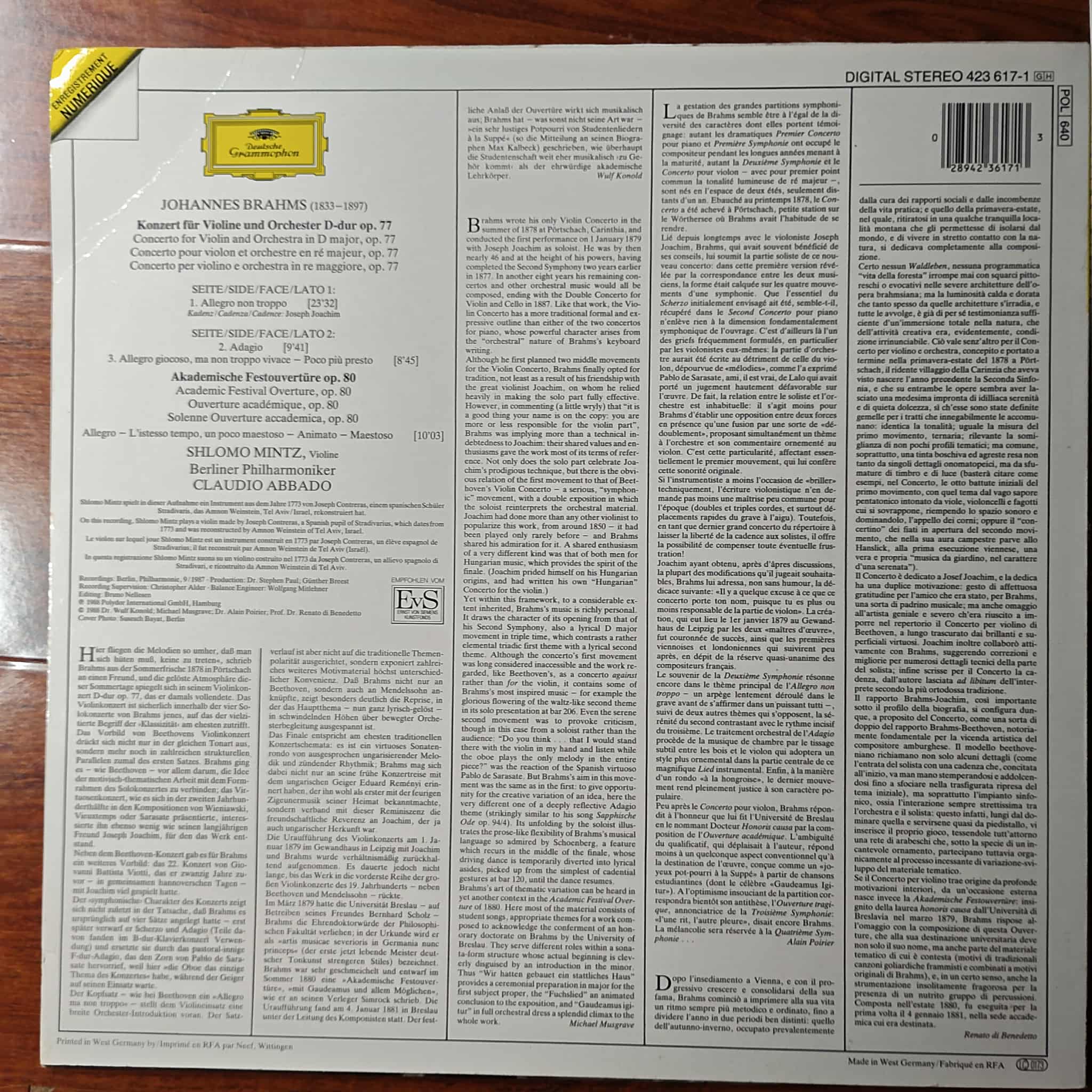 Violin Concerto & Academic Festival Overture của Johannes Brahms, bản thu của Shlomo Mintz, nhạc trưởng Claudio Abbado & dàn nhạc Berliner Philharmoniker.