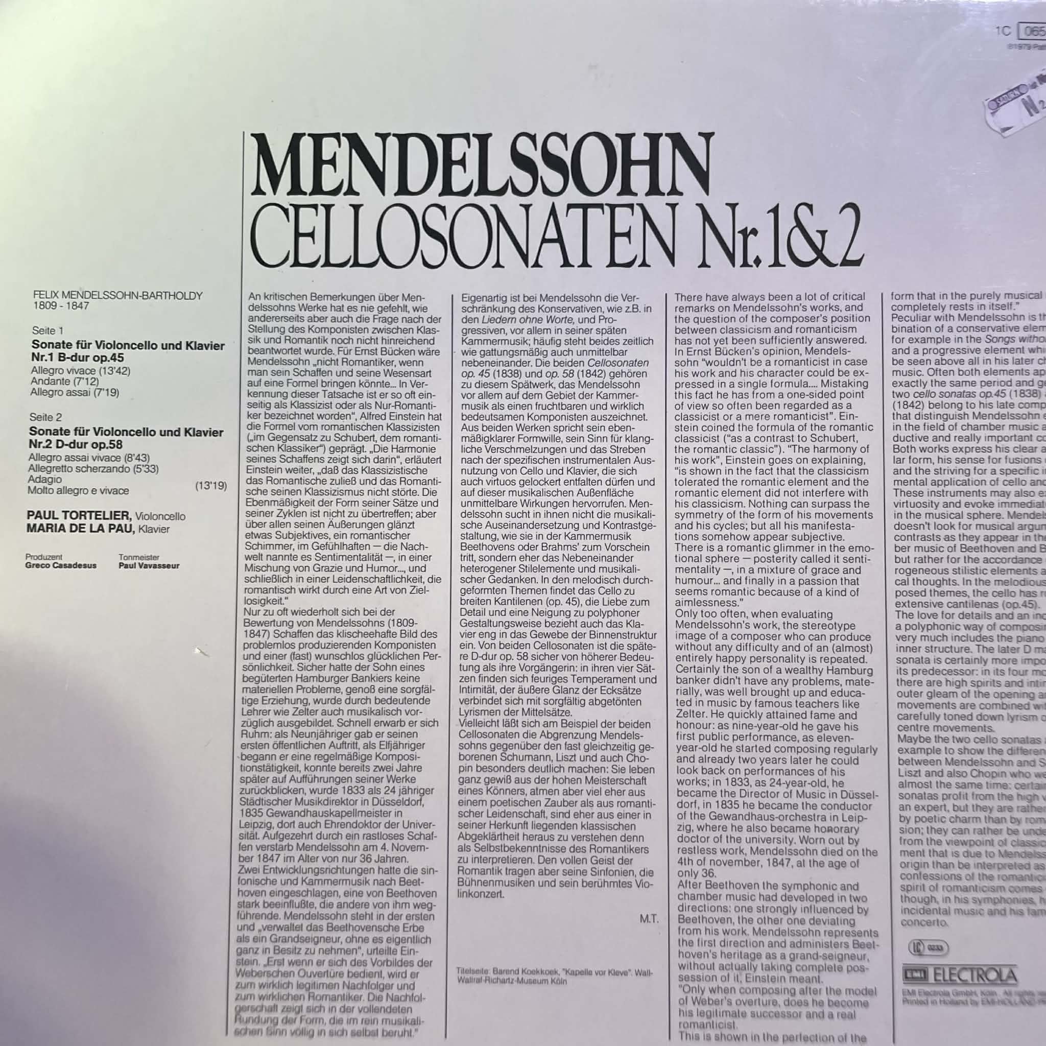 Cellist gạo cội Paul Tortelier trình diễn 2 cello sonatas của Mendelssohn, đệm piano bởi con gái ông, nghệ sĩ pianist người Pháp Maria De La Pau.
