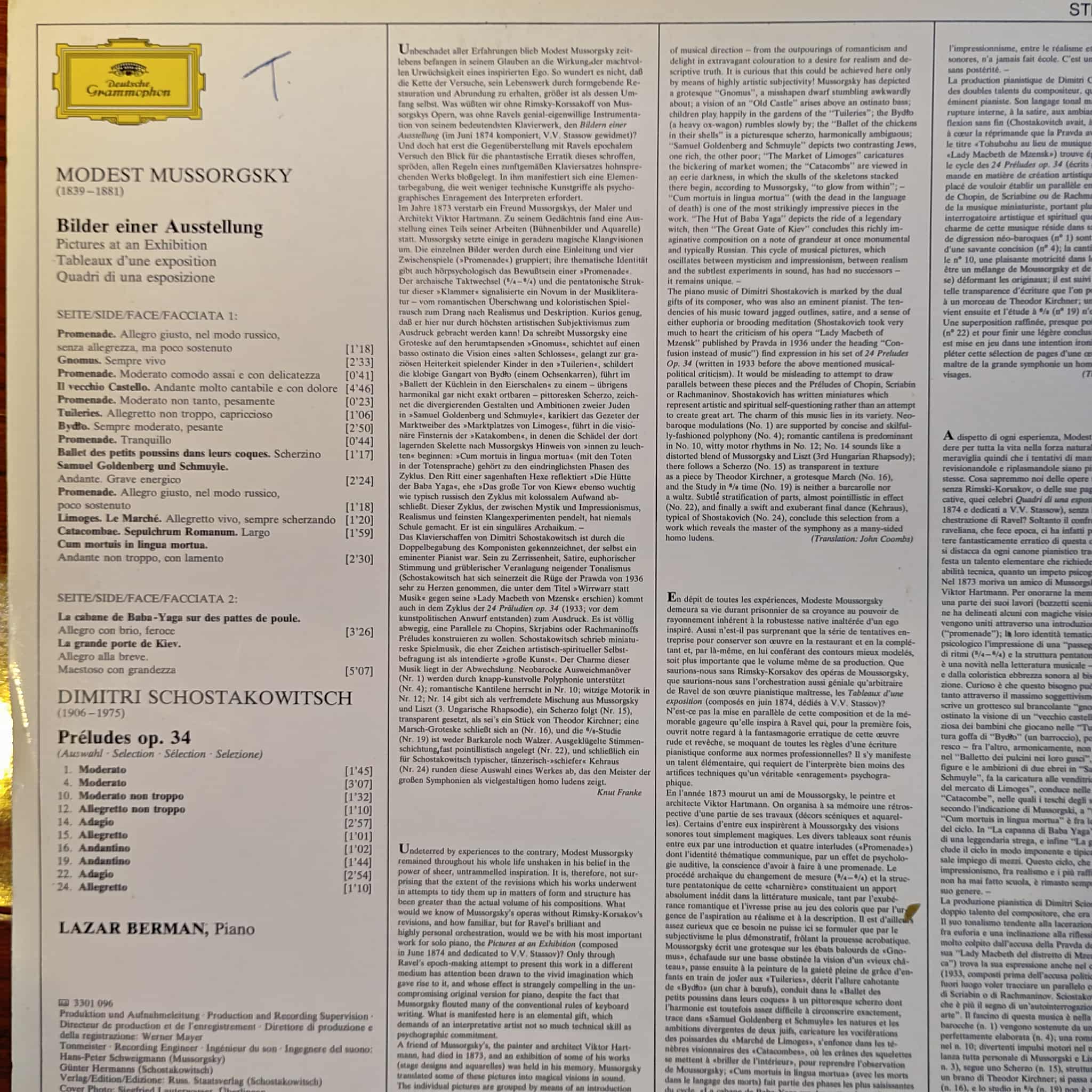 Nghệ sĩ người Xô Viết cũ Lazar Berman trình diễn tác phẩm nổi tiếng nhất của Modest Mussorgsky & các bản nhạc chọn lọc trong Préludes Op. 34 của Dimitri Schostakowitsch.
