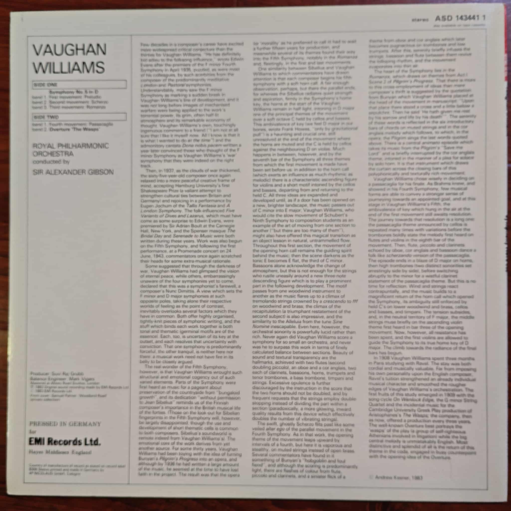 Giao hưởng số 5 của nhà soạn nhạc tiêu biểu Anh quốc cuối thế kỷ 19 Vaughan Williams, nhạc trưởng Sir Alexander Gibson và dàn nhạc hoàng gia Anh Royal Philharmonic Orchestra.